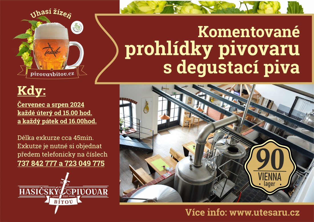 Prázdninové měsíce v Bítově nad Vranovskou přehradou obohatí komentované prohlídky Hasičského pivovaru v centru obce. Budou probíhat pravidelně vždy v úterý (od 15 hod.) a v pátek (od 16 hod.) a jejich součástí bude vždy i ochutnávka 3 druhů právě uvařeného piva Tesák. Jde o nepasterizované a nefiltrované pivo, které získalo řadu ocenění od odborníků i certifikační značku Regionální produkt Znojemska.