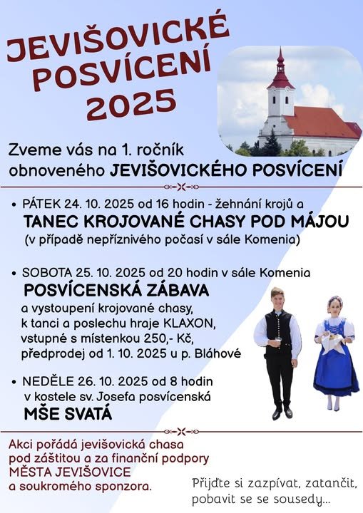 Podzimní posvícení v Jevišovicích odstartuje už v pátek večer tancem krojované chasy. V sobotu večer pak proběhne Posvícenská taneční zábava i s vystoupením krojované chasy. K poslechu i tanci zahraje od 20 hod. skupina KLAXON. Nedělní program zahájí hned ráno slavnostní mše v kostele.