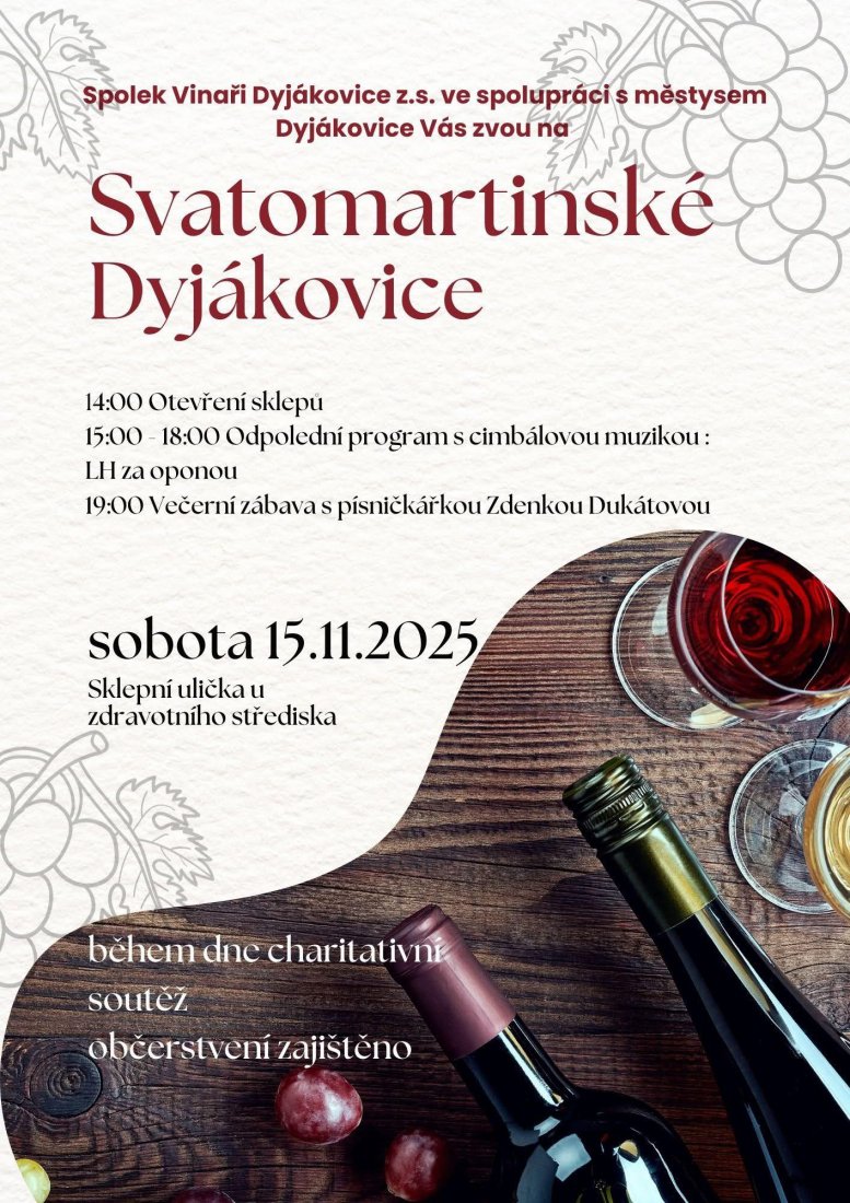 Podzimní vinařská akce, kdy se veřejnosti otevřou od 14 hod. vinné sklepy místních vinařů. Během programu čeká v Dyjákovicích na návštěvníky kromě dobrého vína také cimbálová muzika a večerní zábava s písničkářkou Zdenkou Dukátovou. Během odpoledne proběhne také charitativní soutěž. Občerstvení bude pro návštěvníky zajištěno.
