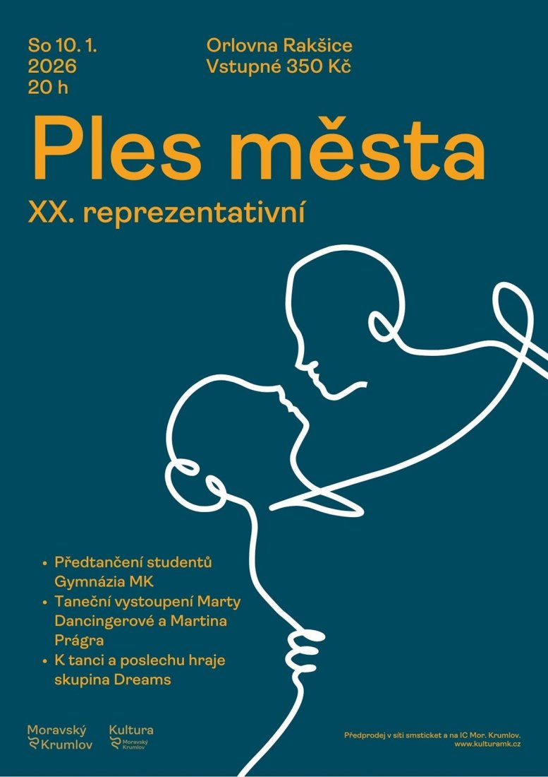 XX. Reprezentační ples města Moravský Krumlov proběhne druhou lednovou sobotu v Orlovně v Rakšicích, na jižním předměstí Moravského Krumlova. Od 20 hod. hraje k tanci i poslechu živá hudba (skupina Dreams) a chybět nebude ani předtančení studentů Gymnázia Moravský Krumlov. O působivé taneční vystoupení se postarají Marta Dancingerová a Martin Prágr, účastníci oblíbené televizní soutěže Star Dance.