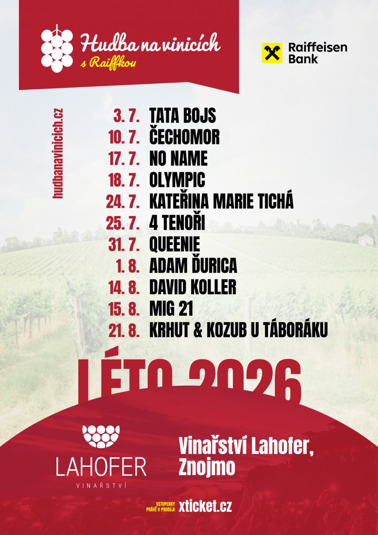 Ročník 2026 sem přinese tyto koncerty: Tata Bojs (3. 7.), Čechomor (10. 7.), NO NAME (17. 7.), Olympic (18. 7.), Kateřina Marie Tichá (24. 7.), 4 Tenoři (25. 7.), Queenie (31. 7.), Adam Ďurica (1. 8.), David Koller (14. 8.), MIG 21 (15. 8.), Krhut & Kozub (21. 8.).