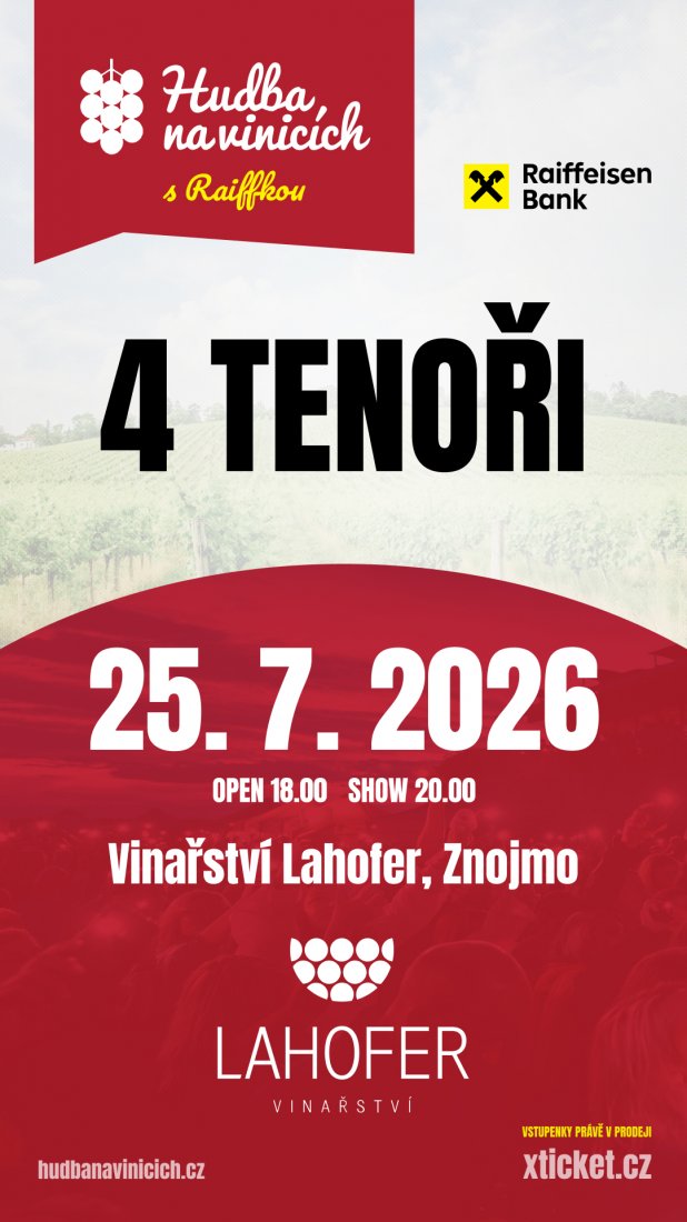 Hudba na vinicích je originální letní festival současné populární hudby, který spojuje hudbu a víno v jedinečném prostředí. Přímo uprostřed vinic, ve vyhlášených jihomoravských vinařstvích, se od června do srpna koná seriál open-air koncertů domácích hudebních špiček. Na Znojemsku je festivalovým centrem Vinařství LAHOFER se svým novým a architektonicky oceňovaným sídlem v Dobšicích u Znojma. Ročník 2026 sem přinese mimo jiné koncert hudebního kvarteta skládajícího se z česko-slovenského seskupení čtyř muzikálových sólistů: Mariana Vojtka, Pavla Vítka, Jana Kříže a Michala Bragagnola. Areál vinařství se otevře v 18 hod. a nabídne kromě skvělého vína i dostatek dalšího občerstvení včetně jídla. Koncert pak začne ve 20 hod. a potrvá do 22 hod.